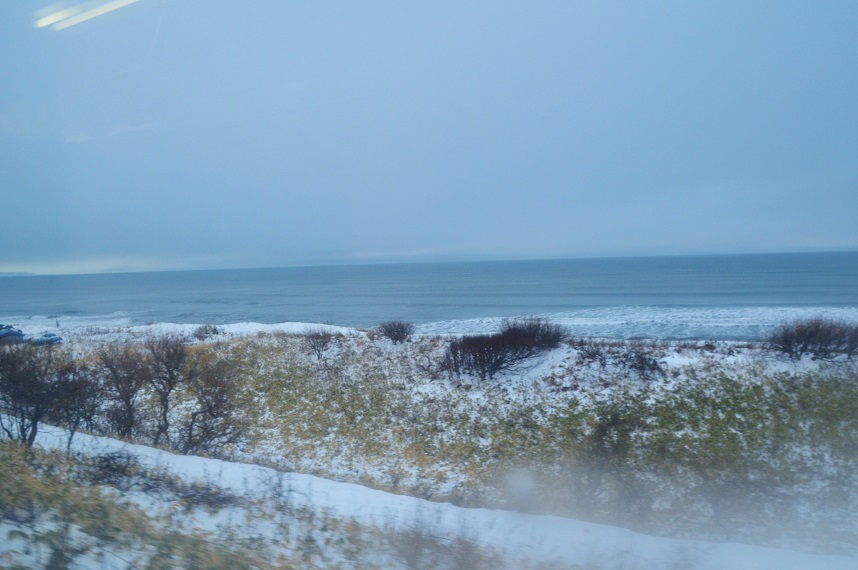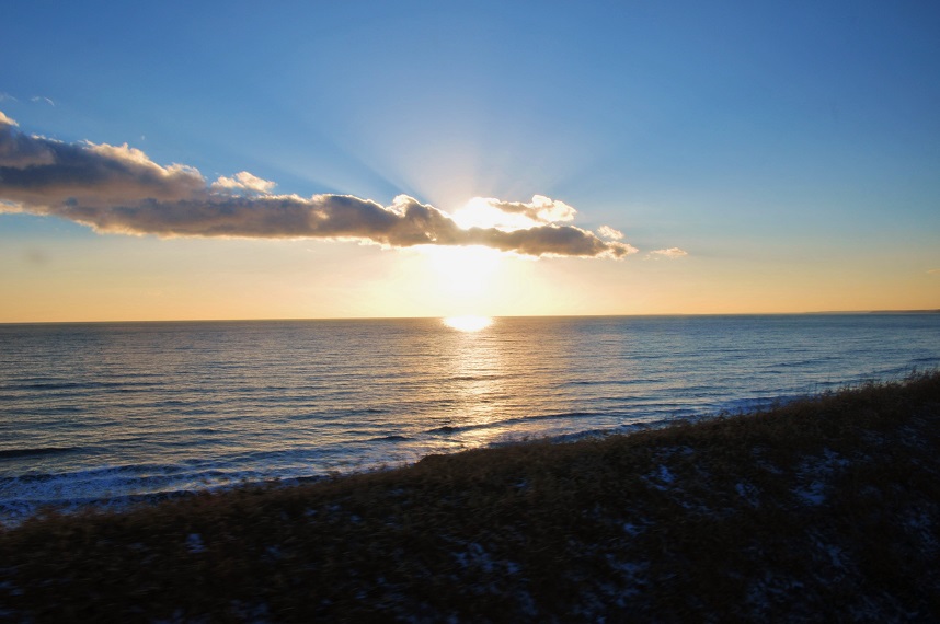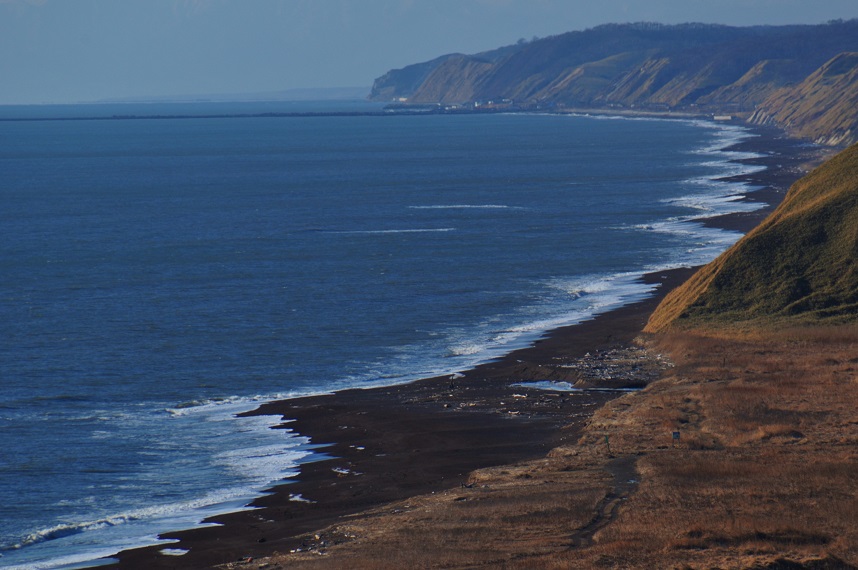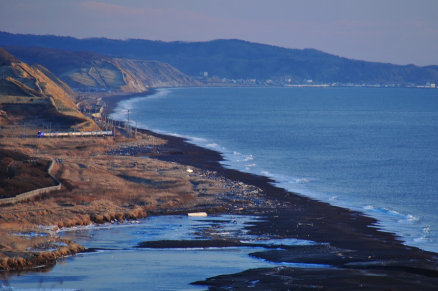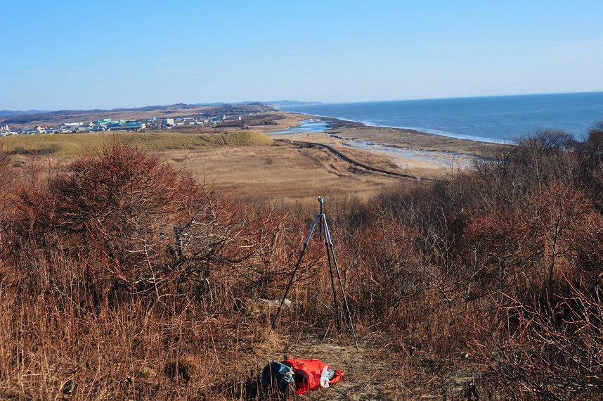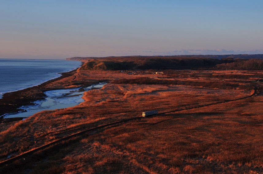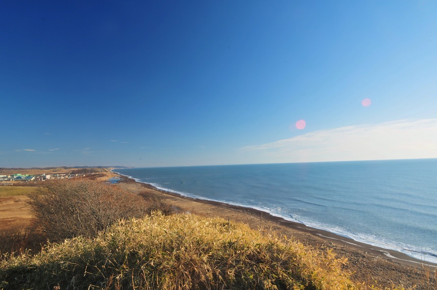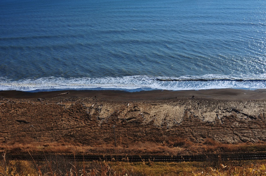 尺別の丘のピークに立つ。眼下には太平洋と原野が広がっている。北海道らしい雄大な景色である。ここからはるか向こうの古瀬方面を望めば太平洋と丘陵地を縫うように走る列車を撮る事ができそうだ。人のブログを色々いろいろ見たけどどれも原野の中を走る列車を撮影したものばかりである。一人くらい今僕が見ている構図で撮ってる人がいても良さそうなもんだが・・・。