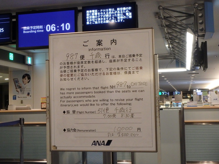 椅子に座って搭乗の案内を待っていたら初めて聞くアナウンスが流れた。僕が乗る便は搭乗予定の人が座席数を上回ってるらしい。で、違う便に変更してもらえる人は申し出てほしいとのこと。つーか座席数より搭乗予定の人が多いってどういうこと???そんな予約の受け方ってあるんかいな???