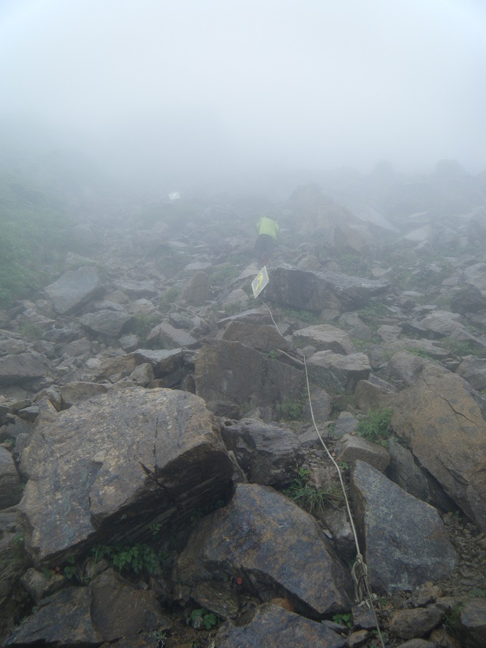そして頂上へ到着。67座目の百名山である。ごらんの通り辺りは真っ白。風も強くてじっとしてると非常に寒い。つーか僕の登山人生こんなのが多いわ。去年の吾妻山、磐梯山、蔵王の東北シリーズもこんな感じだった。つーか梅雨時に登るからこうなるのか???まぁとりあえず67座目の百名山に登頂した。